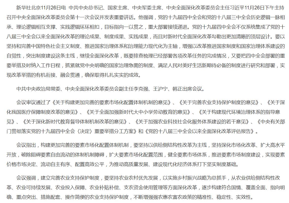 习近平主持召开中央全面深化改革委员会第十一次会议
