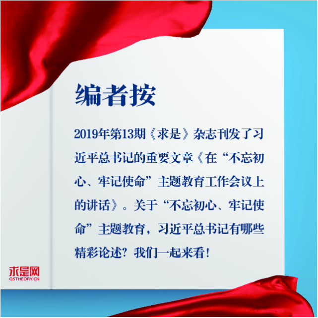 编者按:2019年第13期《求是》杂志刊发了习近平总书记的重要文章《在“不忘初心、牢记使命”主题教育工作会议上的讲话》。关于“不忘初心、牢记使命”主题教育,习近平总书记有哪些精彩论述?我们一起来看!