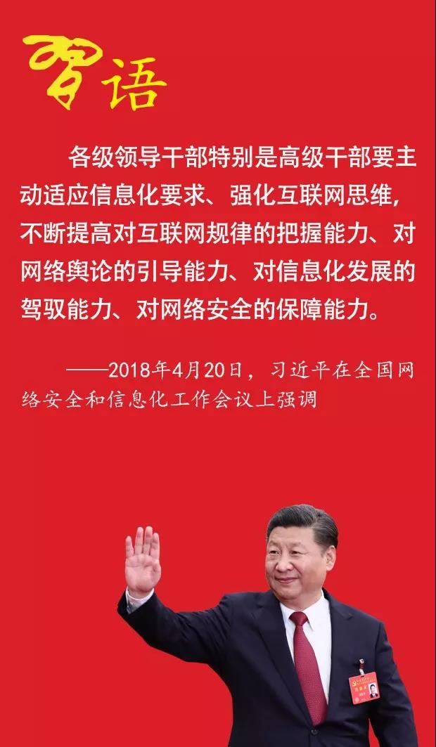 各级领导干部特别是高级干部要主动适应信息化要求、强化互联网思维,不断提高对互联网规律的把握能力、对网络舆论的引导能力、对信息化发展的驾驭能力、对网络安全的保障能力。