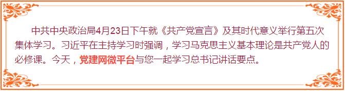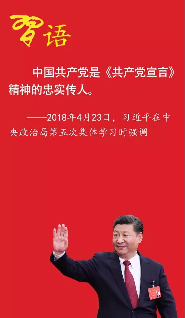 《共产党宣言》为马克思主义建党学说奠定了理论基础。党要领导人民推进伟大社会革命、实现民族伟大复兴,就必须发扬自我革命精神,深入推进全面从严治党的决心不能动摇、要求不能降低、力度不能减弱。要认真贯彻落实党的十九大提出的新时代党的建设总要求和重大部署,在整体推进党的各项建设的同时,重点解决党内出现的新问题,确保我们党永葆马克思主义政党本色、永远走在时代前列、永远做中国人民和中华民族的主心骨。