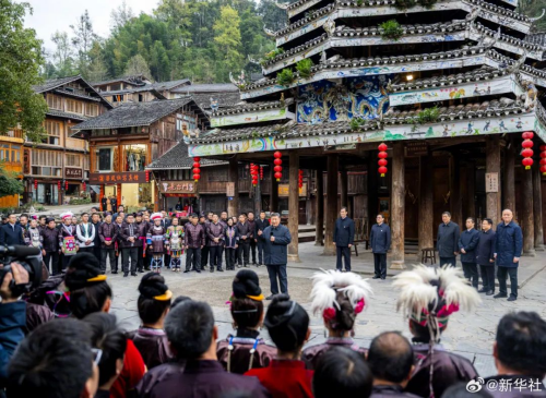 习近平总书记17日下午来到贵州黎平县肇兴侗寨,观看侗族大歌表演,察看村寨风貌和侗族文化展示中心,深入侗乡织、染、绣特色产业基地,同乡亲们亲切交流。习近平说,吊脚楼、古寨、非遗乐器、侗族大歌、蜡染工艺,这些民族的特色,很古朴也很时尚。有党和政府的支持,希望乡亲们的幸福生活更上一层楼,把乡村振兴做得更好,把中国式现代化建设得更好。临别时,乡亲们齐声高唱《侗歌声声唱给党》,热情欢送总书记。歌声悠扬,在村寨久久回荡。