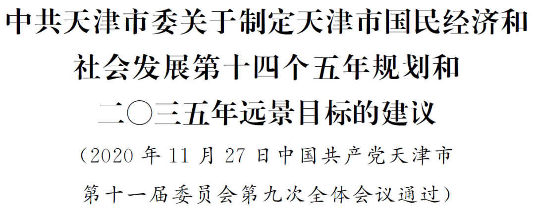“十四五”时期是天津在全面建成高质量小康社会基础上,开启全面建设社会主义现代化大都市新征程的第一个五年,是推动高质量发展、构建新发展格局的关键时期。中国共产党天津市第十一届委员会第九次全体会议认真贯彻落实党的十九届五中全会精神,结合天津实际,就制定天津市国民经济和社会发展第十四个五年规划和二〇三五年远景目标提出以下建议。