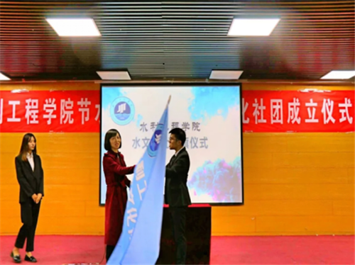 首先,水文化社社长严卓瑜为大家介绍了水文化社成立的背景及建社理念。水文化社以“弘扬水文化 传承水文明”为宗旨,建立社团并开展相关活动,组织大学生一起关注水文化,学习水文化,弘扬水文化,促使更多的人了解水文化。接下来方洁老师上台宣布水文化社正式成立并将水文化社社旗授予社长严卓瑜。