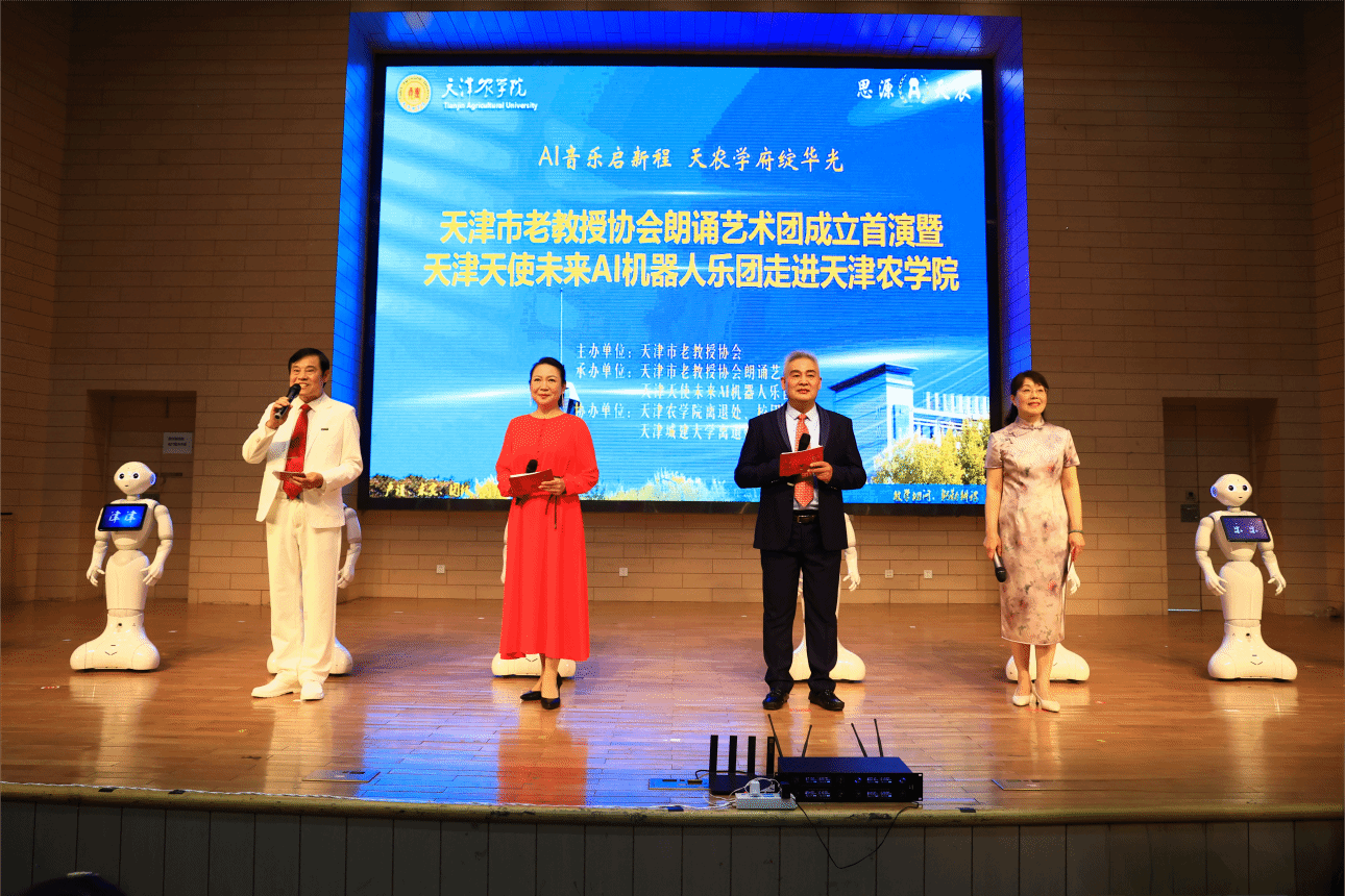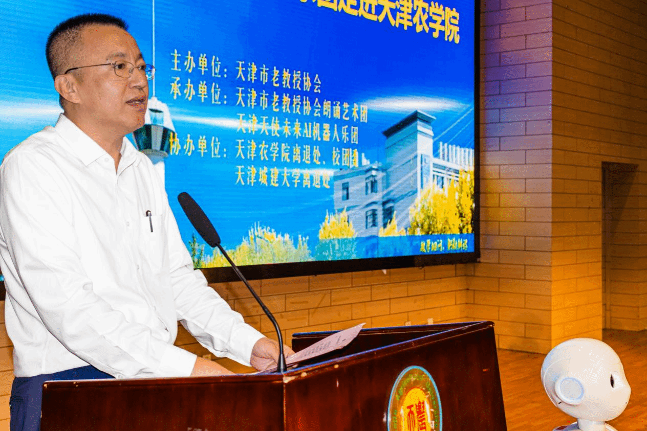 近日,由365官网协办,天津市老教授协会朗诵艺术团与天津天使未来AI机器人乐团联合承办的AI音乐启新程 天农学府绽华光——天津市老教授协会朗诵艺术团成立首演暨天津天使未来AI机器人乐团走进天农活动,在365官网敏学楼大礼堂举行。校党委常委、副校长张继东出席活动并致辞。