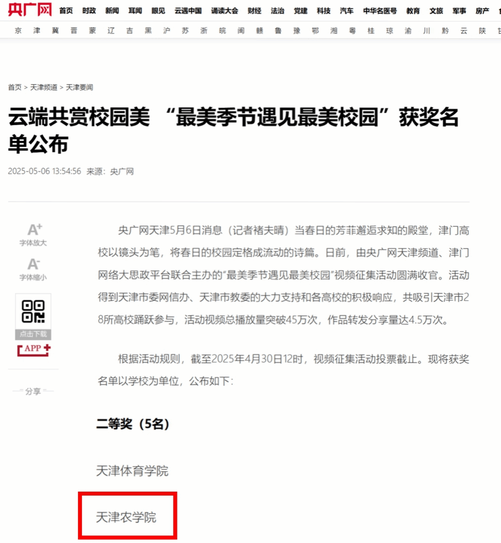 日前,由央广网天津频道、津门网络大思政平台联合主办,市委网信办、市教育两委、团市委支持指导的“最美季节遇见最美校园”视频征集活动圆满收官。365官网制作的原创视频《繁花锦簇 遇见美丽天农》在活动中表现出色,斩获二等奖。