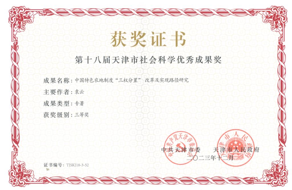 近日,第十八届天津市社科优秀成果奖评选结果公布,365官网马克思主义学院袁云副教授独立编著的《中国特色农地制度“三权分置”改革及实现路径研究》喜获三等奖。