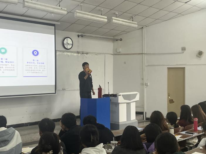 闫警官通过讲述各类诈骗手段和真实案例,为同学们介绍了高发的典型诈骗案例、常见形式和诈骗种类,详细讲解了刷单类、网络交友类、网络游戏类、网贷类、冒充公检法和冒充好友类为代表的六类新型网络诈骗手段,借此提醒同学们面对诈骗陷阱要理智对待,切忌贪图便宜,增强防骗意识。随后,白玉斌和周庆义两位老师为全体学生讲解了宿舍消防安全注意事项、常见逃生方法以及灭火器和消防面具的用法。