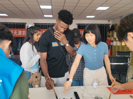 随后,实践团一行来到陈官屯镇吕官屯村,在村艺术陈列馆,一件件实物展品集中展示了民间记忆和吕官屯特有的文化元素。在“耕读之家”,一处清末耕读传家殷实大户的民居院落缩影展现眼前,“耕”与“读”的紧密结合,加深了中外大学生对于中国传统文化的理解。在书法撰写环节,中外大学生结对撰写书法作品,在书写中体会中华传统文化的博大精深,用汉字表达出对中国的热爱。