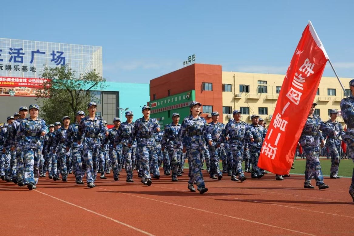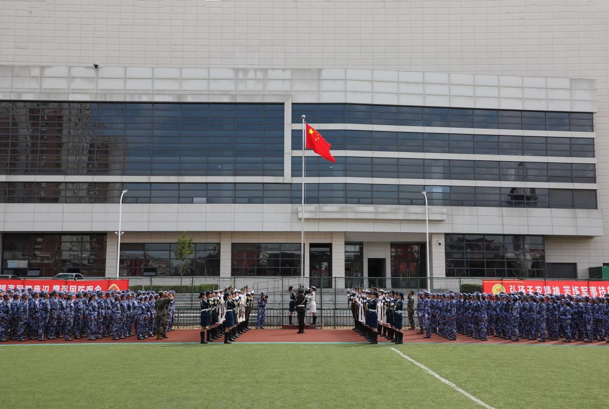 在庄严的升国旗仪式中,军训成果汇报大会正式拉开帷幕。伴随着五星红旗冉冉升起,全体师生齐声高唱国歌。