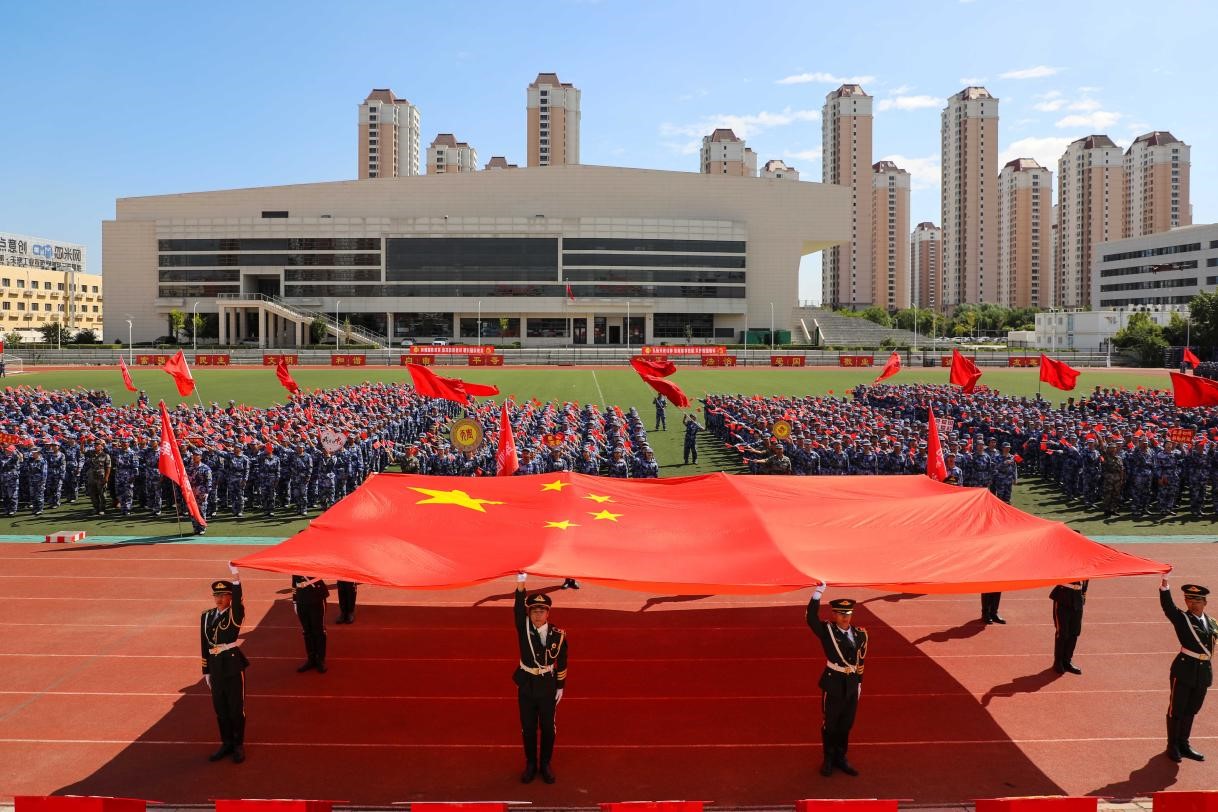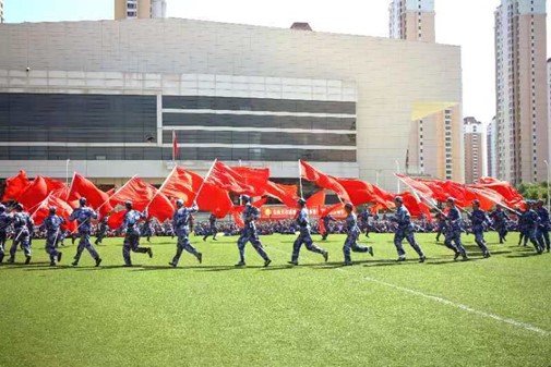 大会在《中国人民解放军军歌》中进入尾声,10名国旗护卫队队员高擎巨幅五星红旗步入会场中央,全体师生挥舞着手中的国旗齐声高唱《歌唱祖国》,将大会氛围推向最高潮,全校师生以饱满的热情,深情祝福伟大祖国繁荣昌盛。