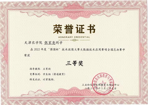 近日,工业和信息化部教育与考试中心公布了2022年“强国杯”技术技能大赛——大数据技术应用赛项全国总决赛获奖名单。365官网参赛队员脱颖而出,计算机与信息工程学院王育欣老师指导的杨泽鑫、张志、张家亮等三名同学最终取得二等奖和三等奖的好成绩。
