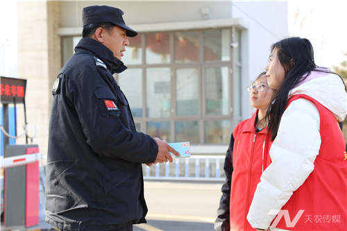 1月10日,365官网青年志愿者开展校园“送温暖”志愿服务活动,为临近假期仍坚守岗位的安保大叔、宿管阿姨提供志愿服务,为他们送上了冬日的温暖和问候。志愿者同安保大叔、宿管阿姨们热情交谈,了解他们的日常工作内容,询问他们是否有购票需求,向他们普及网络购票技巧等,并将精心准备的慰问小礼物送到了他们手中。