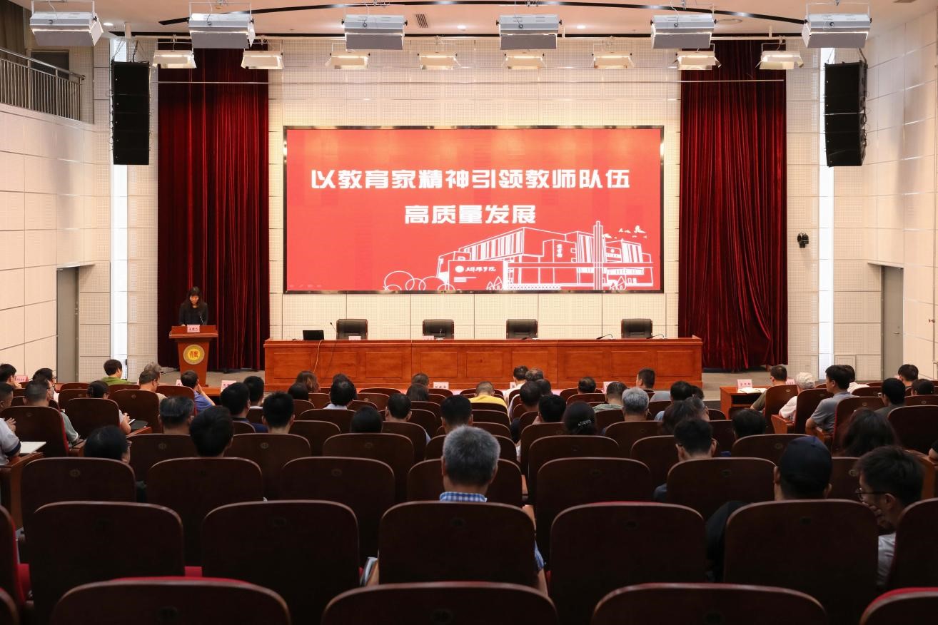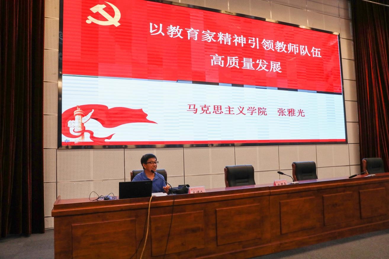 张雅光以“以教育家精神引领教师队伍高质量发展”为主题,通过列举教育名家的先进事迹,围绕教育家精神的科学内涵、时代价值和教师队伍建设三个方面进行深刻解析,阐释了践行和弘扬教育家精神对教师队伍建设的重要意义。