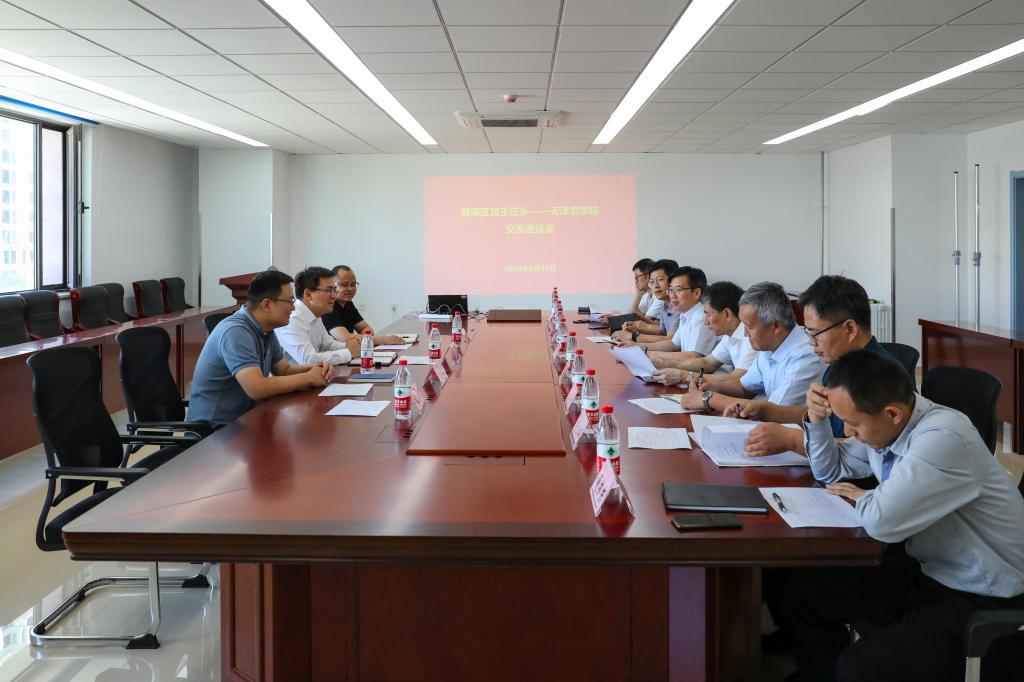 李鑫代表学校对金晶一行来校交流表示欢迎。他指出,良王庄乡是静海区农业大镇,学校与良王庄乡也有着良好的前期合作基础,希望双方进一步深化合作。学校将积极组织专家服务团,因地制宜对接良王庄乡的产业发展需求,围绕梨、水产、蔬菜等优势产业,发挥学校良种、良技优势,提供种养殖技术培训和产业发展规划指导,助力良王庄乡农业发展。他建议良王庄乡在农产品深加工方面加强谋划,推动农业“接二连三”;在乡村文旅发展方面加强顶层设计,充分挖掘资源,推进文旅和农业深度融合。