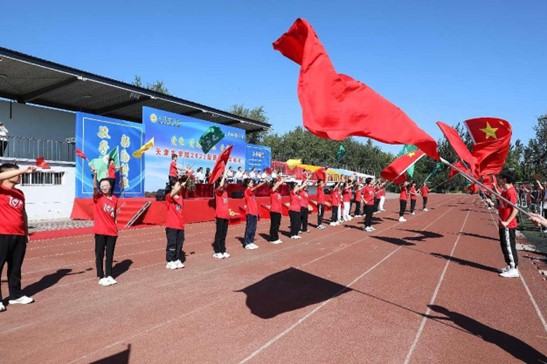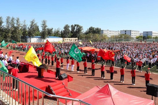 鲜艳的五星红旗在全体师生齐声高唱国歌声中冉冉升起,开学典礼在庄严的氛围中拉开序幕。伴随着校歌激情欢快的旋律,三名旗手护卫着校旗走向主席台,全体师生齐唱校歌。