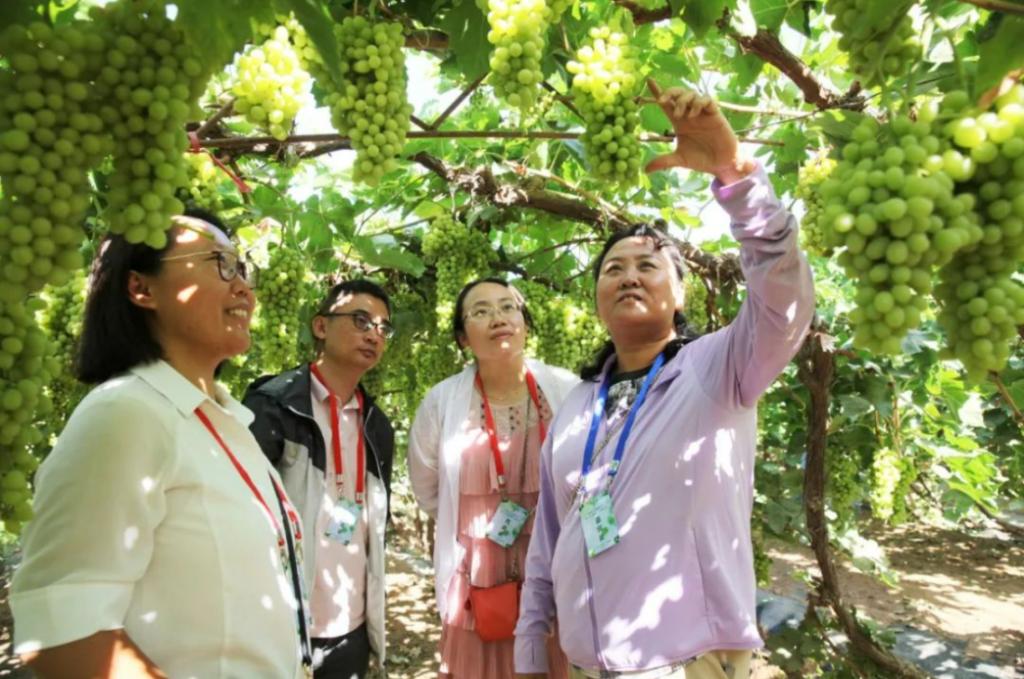 7月14日,在三堡乡葡萄示范园,中国农学会葡萄分会常务副会长、国家葡萄产业体系岗位专家、英国365上市公司官网田淑芬研究员正在向团队教师介绍无核白葡萄的管理种植情况。
