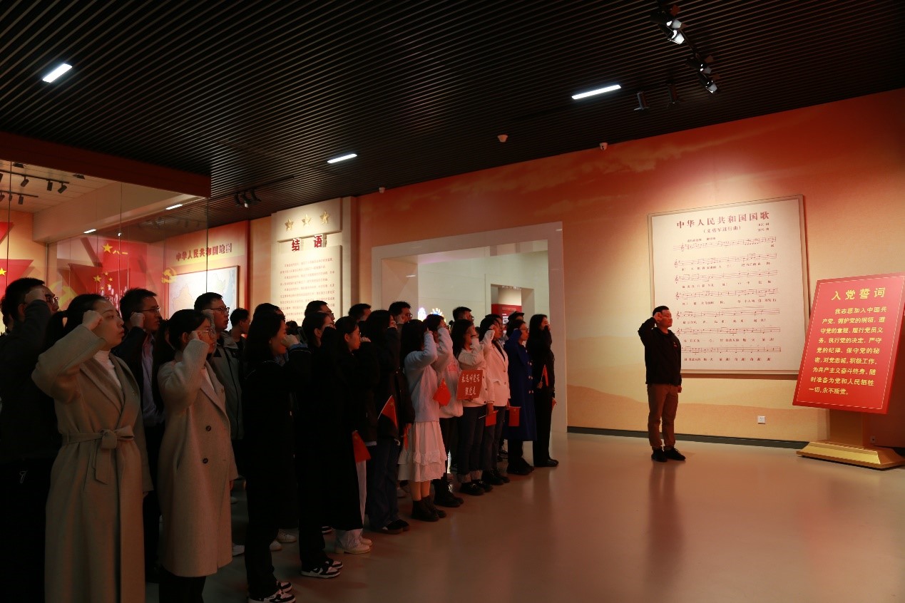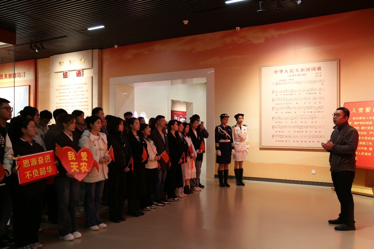 当天上午,晨风习习,细雨蒙蒙。平津战役纪念馆胜利广场上,气氛庄严肃穆,研学团师生面向巨幅雕像整齐列队,校国旗班成员向革命烈士敬献花篮。随后,师生缓步前行,向革命烈士敬献鲜花,表达对革命先烈的深切缅怀和崇高敬意。仪式后,马克思主义学院江涛老师在展厅内为研学团讲授主题思政微课,与师生一同回顾平津战役胜利的历史背景和重大意义。江涛老师从天津生产的第一辆自行车——飞鸽自行车等建国以来的多项全国第一讲到如今“十项行动”再塑天津新活力,既有对天津城市历史的回顾,更描述了天津扎实推进中国式现代化战略部署的实景图,加深了青年学生对天津的归属感和认同感。思政微课后,全体师生党员面向党旗重温入党誓词。研学团师生一同参观展馆内“战役决策”“战役实施”“人民支前”“伟大胜利”“英烈业绩”五大主题展厅。在2020级旅游管理专业焦宇耀、陈诗雨两位学生讲解员的讲解中,师生们共同回顾了平津战役从战前准备到浴血战斗,并取得最终胜利的全过程,学习平津战役中革命先辈的英勇事迹,感受津沽大地红色历史文化。