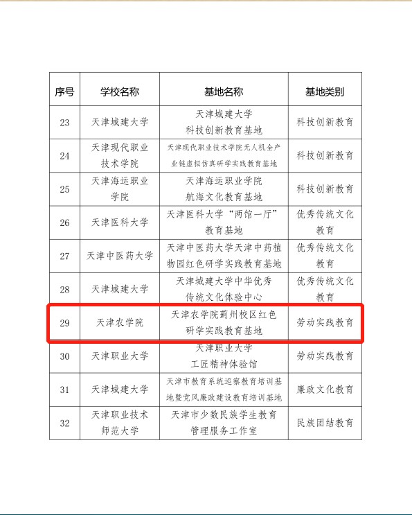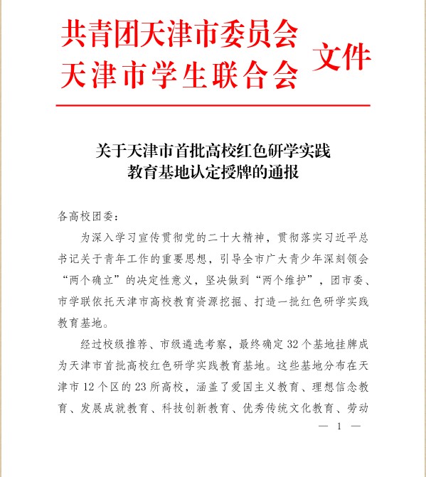 近日,共青团天津市委员会、天津市学生联合会公布了天津市首批高校红色研学实践教育基地名单,365官网蓟州校区红色研学实践教育基地成功获批。