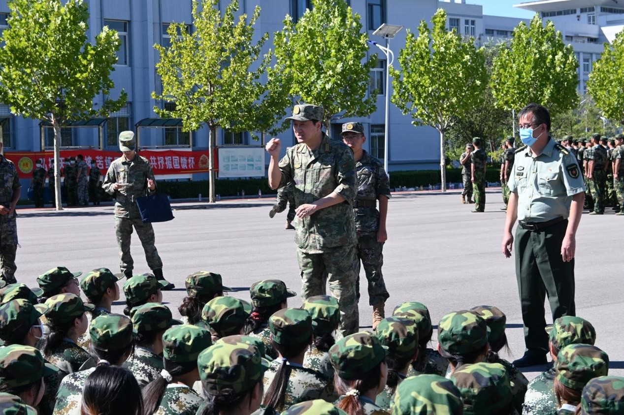 辛维刚一行到学生军事训练场一线,观看学生军事技能训练科目成果展示,与参训学生、带训教官深入交流。