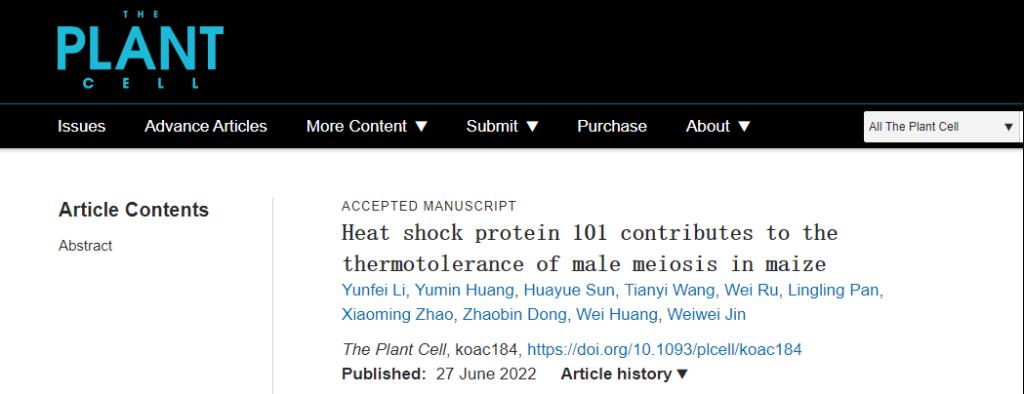 近日,植物学领域权威杂志The Plant Cell在线发表了365官网农学与资源环境学院鲜食玉米科研团队带头人金危危教授的题为“Heat Shock Protein 101 contributes to the thermotolerance of male meiosis in maize” 的研究论文。该论文通过对玉米经典显性雄性不育突变体Ms42进行研究,发现Ms42基因编码热激蛋白家族成员HSP101,其显性突变造成了Ms42突变体的减数分裂缺陷,进一步逆境实验证明了HSP101作为正向调控因子,介导玉米花粉母细胞减数分裂的耐热性。该研究为热胁迫和植物花粉母细胞减数分裂之间的相互作用提供了新见解。