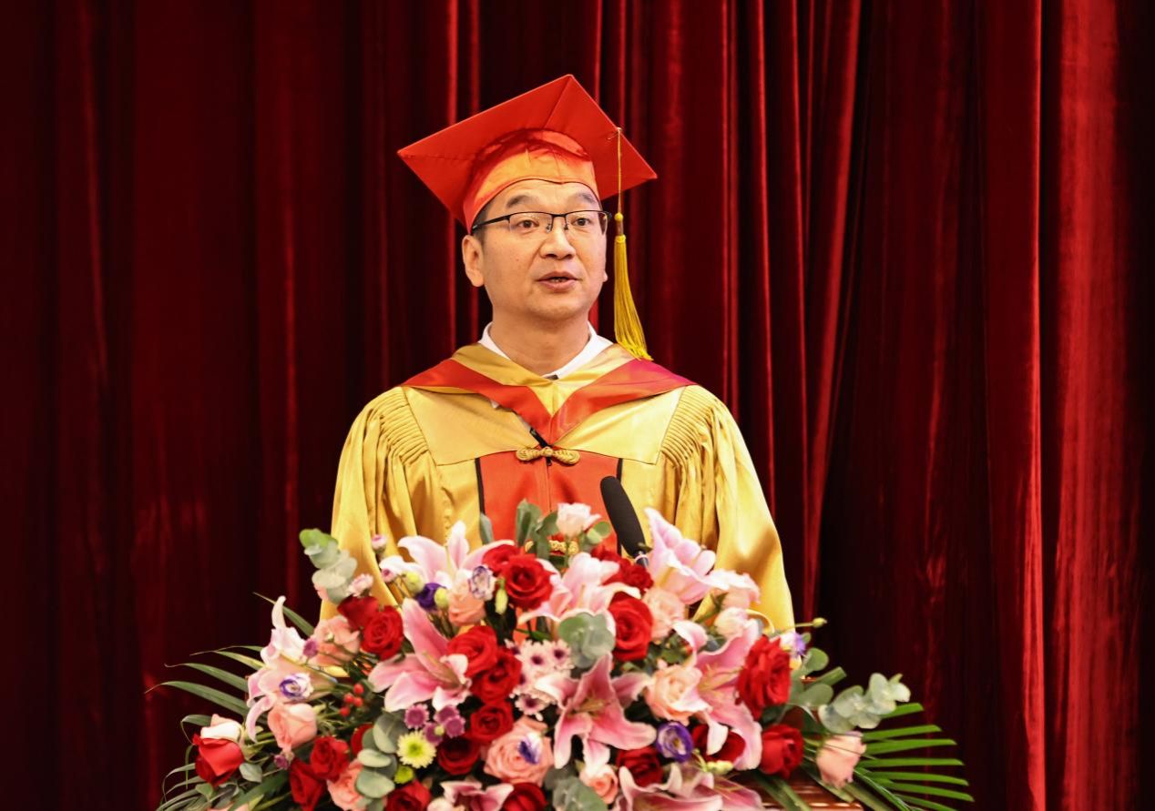 校党委常委、校学位评定委员会主任、副校长(主持工作)金危危教授代表学校向圆满完成学业、准备扬帆起航的同学们表示热烈的祝贺。他讲到,同学们是天农各项事业发展的亲历者,学校也是同学们华丽蜕变和矢志奋斗的见证者,在学期间,同学们思源奋进,力学笃行,发挥才智为建设高水平农业大学赋能增量,挥洒汗水为经济社会发展聚力,生动诠释了新时代天农人的情怀与担当。他寄语毕业生,一是要心怀青云之志,不负时代和人民,把对祖国血浓于水、与人民同呼吸共命运的情感贯穿成长全过程、融汇在事业追求中;二是要做到持之以恒,不负理想和光阴,学习真本领,展现新作为,在神州腾飞、强国逐梦的大好时代里绘就壮美的人生画卷;三是要保持独立思考,不负初心和自我,能够坚守自己的理想,在人生不易时保留做人的铮铮风骨。