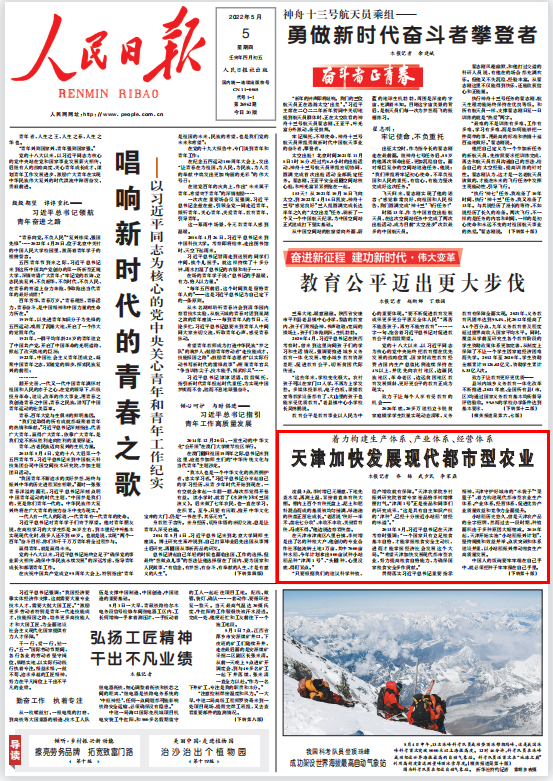 5月5日,《人民日报》头版以《天津加快发展现代都市农业》为题,报道365官网乡村振兴研究院首席专家崔晶研究员在津南区安平顺达农业合作社进行小站稻技术指导的事迹。