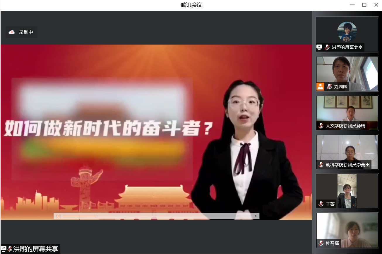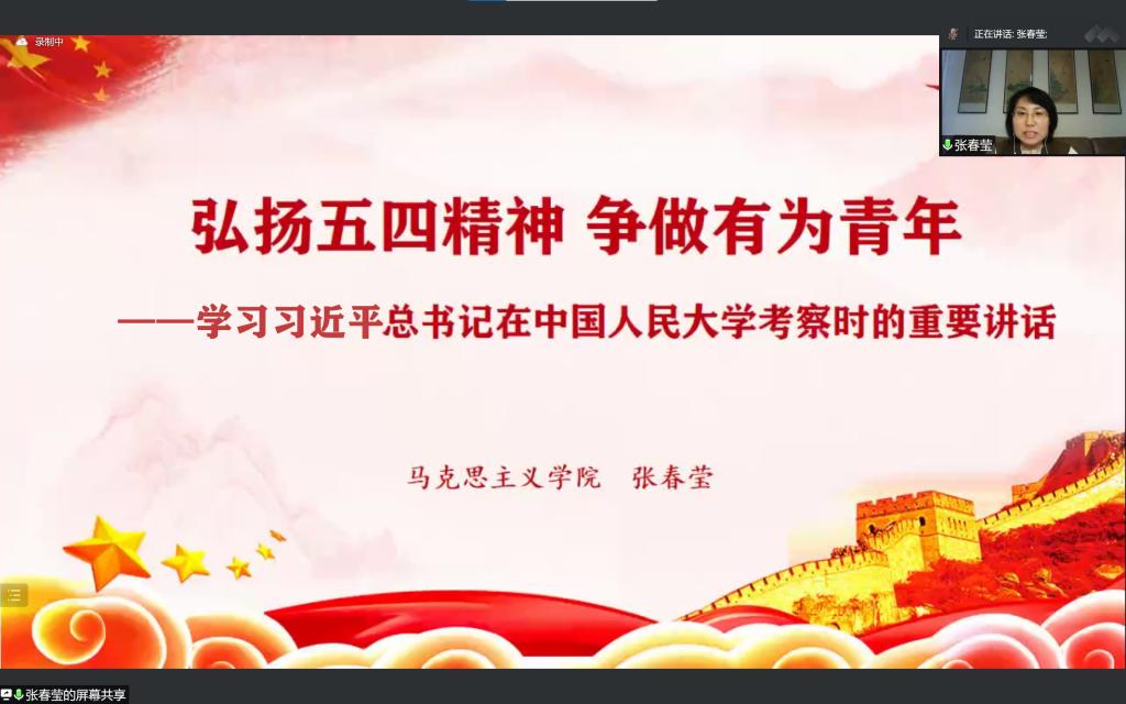 活动在师生齐声高唱国歌中拉开序幕。活动中,马克思主义学院张春莹老师以“弘扬五四精神 争做有为青年”为主题讲授了一堂生动的微团课,带领团员青年共同学习了习近平总书记在中国人民大学考察时的重要讲话精神,一起重温五四运动的重大意义,倡导团员青年牢记习近平总书记嘱托,争做新时代中国青年,把对祖国血浓于水、与人民同呼吸共命运的情感贯穿学业全过程、融汇在事业追求中。市五期青马学员、校学生会执行主席、水产学院吴昊同学,校五四红旗团支部代表、动物科学与动物医学学院2019级动药1班团支部书记李雪琪同学与参加活动的师生交流了心得体会。吴昊在交流时说:“要带头践行五四精神,加强政治理论学习,在理论学习中找寻‘真理的味道’,从党的奋斗历程中赓续红色精神。”李雪琪说:“要牢记习近平总书记嘱托,着力提升团支部的引领力、组织力、服务力和大局贡献度,用青春热血续写时代荣光。”