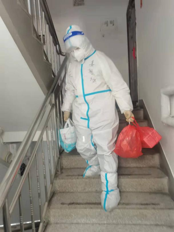 严守纪律,恪守底线。进入封控红区,老师们必须遵守封控区的各项管理规定。要做好“守门员”,第一要务就是要提高政治站位、树牢底线思维,学习自我防护,保证做到“零感染”。严格按照防护服的穿戴流程,每一项工作完成后都要进行自我消毒和防护,尽管寒冬的消毒水非常冰冷,但是同志们都毫无怨言。吴凯老师天生就是个热心肠,乐天派、开心果,但是面对这工作,吴凯老师表现得异常严肃和镇静,他说这次工作事关人民生命安全,事关天津市疫情防控大考,绝不能掉以轻心,思想麻痹,不到胜利,绝不松懈。姜航旗老师说:“自我防护非常重要,也很复杂,但是只有保护好自己,才能更好为人民群众服务,才能守护好我的第二故乡——哏都。从上大学就来到了天津,今年刚好十个年头了,这里就是我的第二故乡,守护好天津义不容辞,相信在我们共同努力下,必将战胜疫情!”