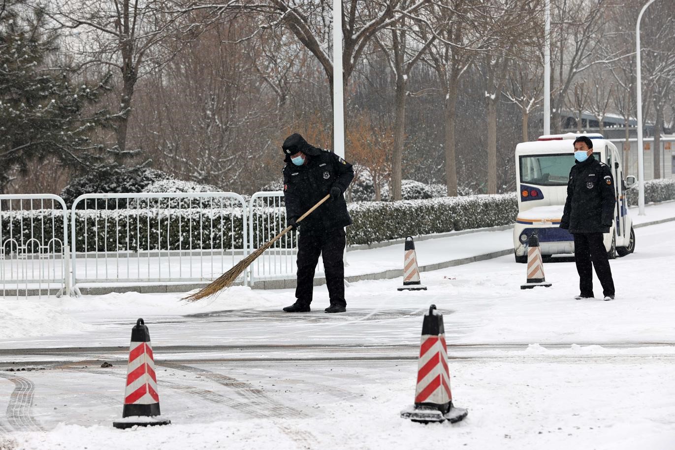 居住在疫情管控区的教师党员在社区清扫积雪,畅通社区道路