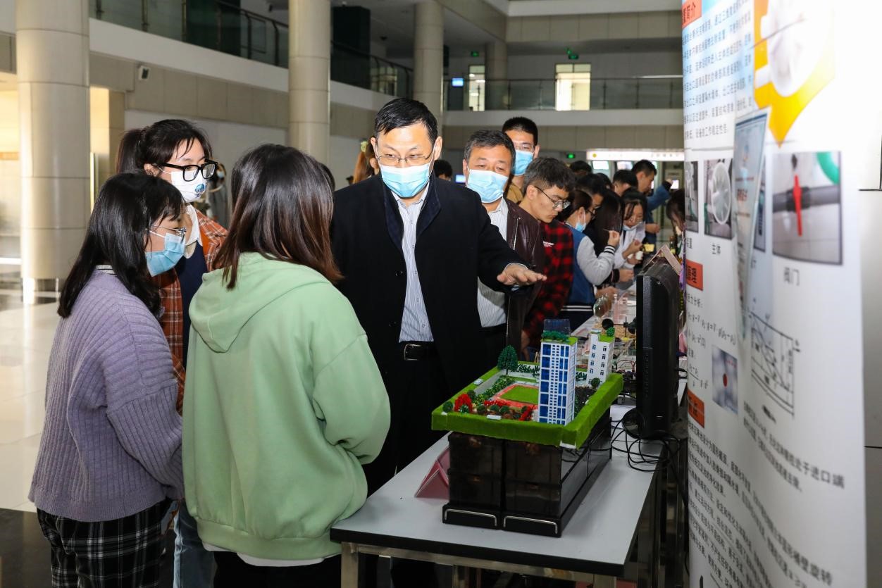 张民仔细观看展台上的每一件作品,认真聆听学生讲解,与同学们面对面交流作品立意、制作原理和应用前景并提出建议,现场气氛活跃。张民对此次实践教学月活动中同学们取得的实践教学成果给予高度肯定,并表示,期待有一天可以将同学们的创意运用到企业生产中,转化为现实生产力,助力国家经济社会高质量发展。