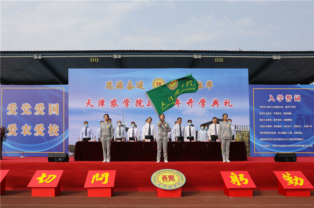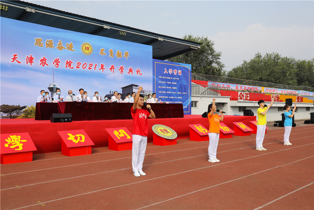 学工部迪里夏提老师带领全体新生入学宣誓,誓以成为天农人而自豪,爱党爱国爱农爱校,将小我融入大我,思源奋进,做德智体美劳全面发展的社会主义建设者和接班人,为乡村振兴,实现中华民族伟大复兴的中国梦奉献青春力量。