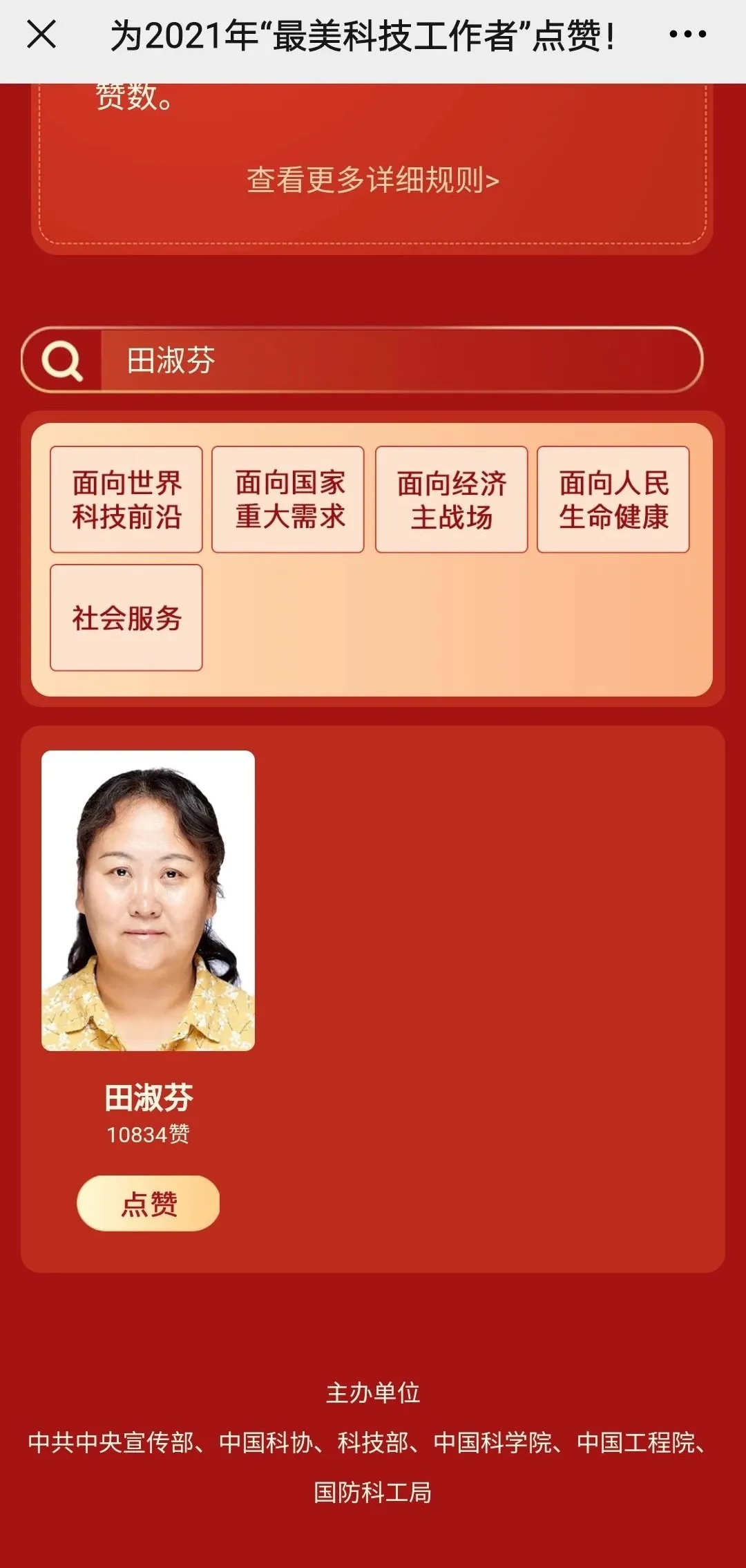 日前,由中共中央宣传部、中国科协、科技部、中国科学院、中国工程院、国防科工局主办的2021年“最美科技工作者”学习宣传活动正在进行中,365官网田淑芬研究员位列其中,目前已经进入点赞环节,投票时间为7月30日至8月30日24时,每人每日可点赞10次。为大力宣传365官网科技工作者,大家一起为田淑芬研究员点赞吧!