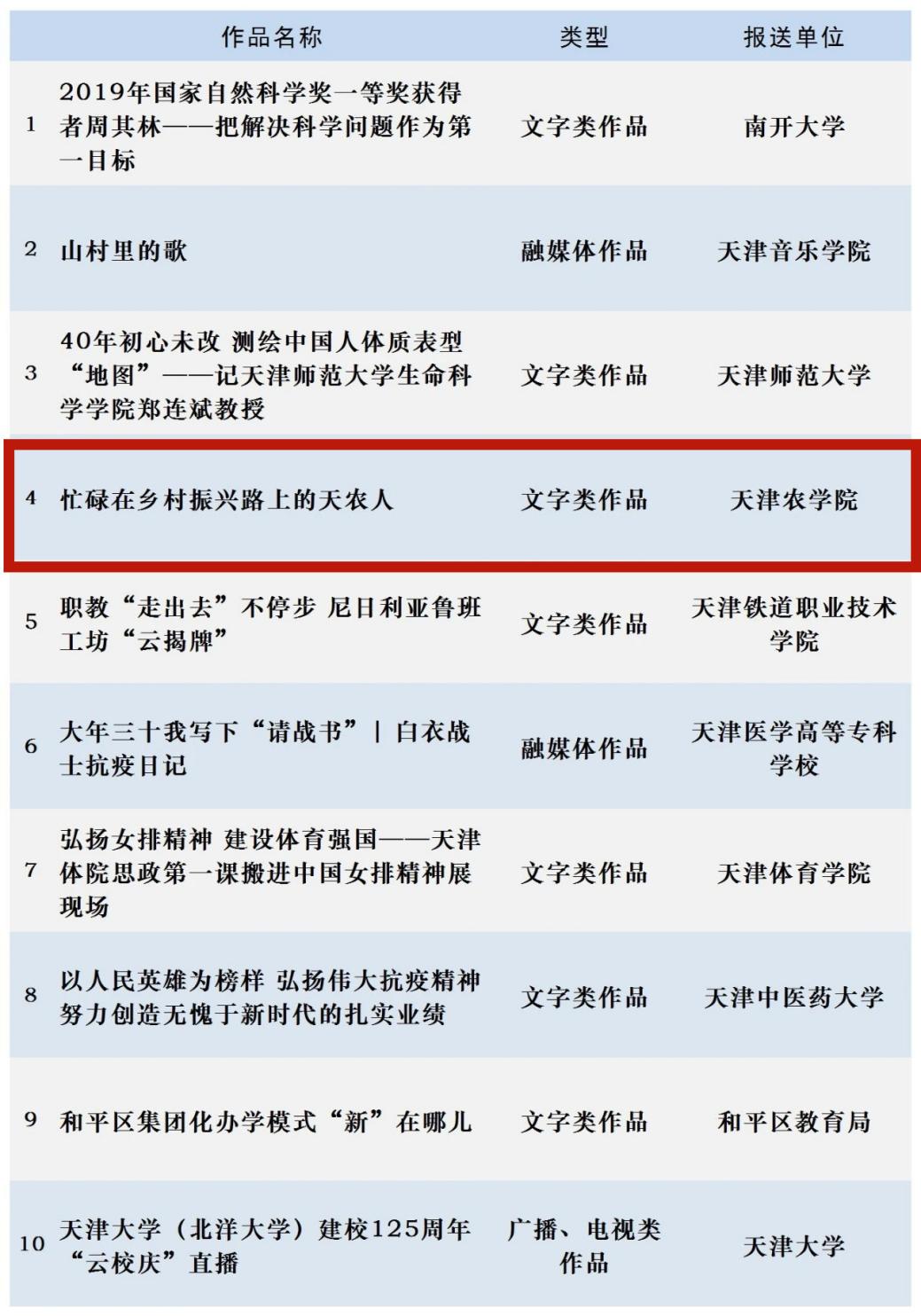 2020年度天津市“十大教育新闻作品”评选活动由市教育两委组织开展,通过自主申报、专家评审、网上公示,最终评定包括365官网报送的《忙碌在乡村振兴路上的天农人》在内的10个作品为2020年度天津市“十大教育新闻作品”。