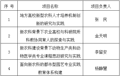 新农科研究与改革实践项目是教育部为深入贯彻落实习近平总书记给全国涉农高校的书记校长和专家代表重要回信精神、加快新农科建设从“试验田”走向“大田耕作”、推进高等农林教育创新发展的重要举措,旨在引导各高校以立德树人为根本,以强农兴农为己任,优化涉农专业结构,深化高等农林教育教学改革,全面推动新农科建设,加快培养知农爱农新型人才。(文字:教务处 刘慧)