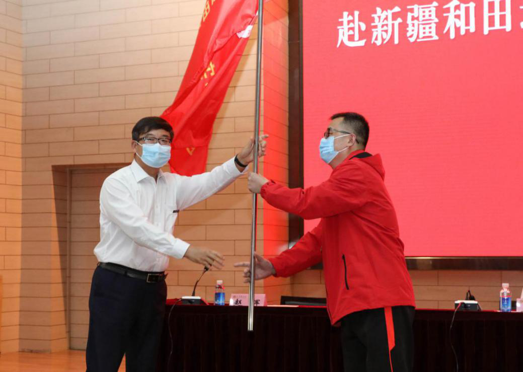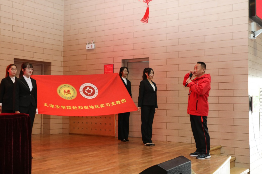 张民宣读成立临时支教团的决定,赵辉向实习支教团授团旗。