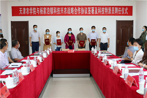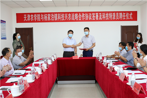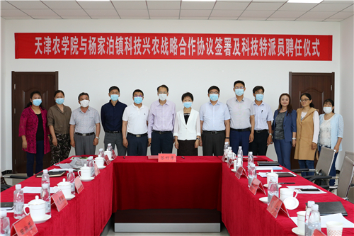 6月2日,乡村振兴研究院与杨家泊镇人民政府科技兴农战略合作协议签署及科技特派员聘任仪式在杨家泊镇文化中心举行。滨海新区区委常委、组织部长张弢,365官网党委副书记、校长王延文和副校长、乡村振兴研究院院长赵辉,杨家泊镇党委书记闫宁和党委副书记、镇长刘向昱出席,仪式由杨家泊镇党委副书记刘琨主持。