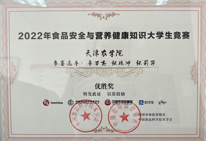 由食品科学与生物工程学院学生辛万杰、张兆冲、张莉莎组成的参赛队在2022年“百胜杯”食品安全与营养健康知识大学生竞赛中荣获天津分站赛冠军,并代表天津参加了全国总决赛。选手们在比赛前期进行了大量的知识积累,创作了很有新意的短视频,为这次比赛做了充分的准备。