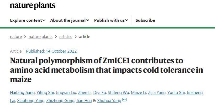 2022年10月14日,Nature Plants杂志(2021年影响因子17.35)在线发表365官网玉米团队刘静妍副研究员与中国农业大学植物生理生化国家重点实验室杨淑华教授团队合作的(刘静妍为共同第一作者)题为“Natural polymorphism of ZmICE1 contributes to amino acid metabolism that impacts cold tolerance in maize”的研究论文。该研究利用高分辨质谱和代谢组学技术结合揭示了冷信号关键转录因子ZmICE1启动子区自然变异与玉米耐冷性的关系,阐明了ZmICE1通过调控氨基酸代谢和活性氧水平调控玉米对低温响应过程的分子机制。