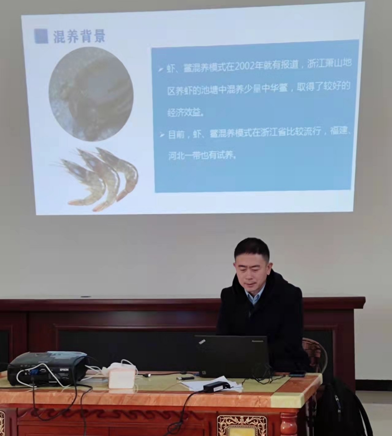 16日,受天津市武清区农业发展服务中心邀请,王庆奎教授到武清区上马台镇文河水产养殖专业合作社,为周边养殖户开展水产养殖技术培训,作了题为“虾鳖生态混养”的技术报告。王庆奎教授分别从虾鳖生态混养的技术原理、优点,虾鳖生态混养模式,虾鳖生态混养注意事项,以及国内虾鳖生态混养的经验与收益等方面,为养殖户做了详细讲解。培训会上,王庆奎教授与养殖户热烈互动,详细解答了养殖户的技术咨询,培训周边养殖户数十户。(水产学院供稿 文字:王庆奎;编辑:张倩;审校:田健)