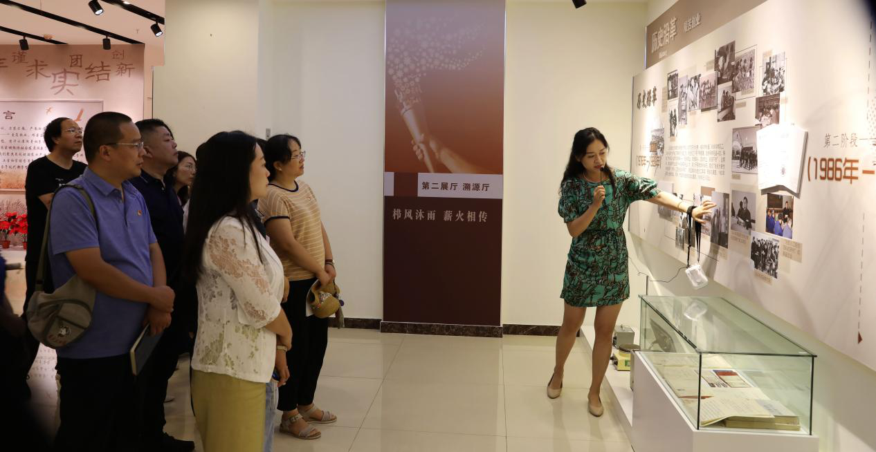 此次活动邀请到机关党委书记韩斌、教务处处长金天明、学工部副部长韩兰贞、宣传部邹青颖老师作为讲解员,带领大家参观校史馆。