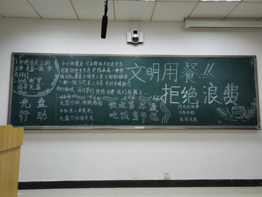 为推动节约光荣、浪费可耻理念深入人心,学院组织同学们开展了“拒绝浪费”主题板报宣传评比。“锄禾日当午,汗滴禾下土……”一句句经典的诗篇告诫大家粮食来之不易,一定要学会节约,学会珍惜。