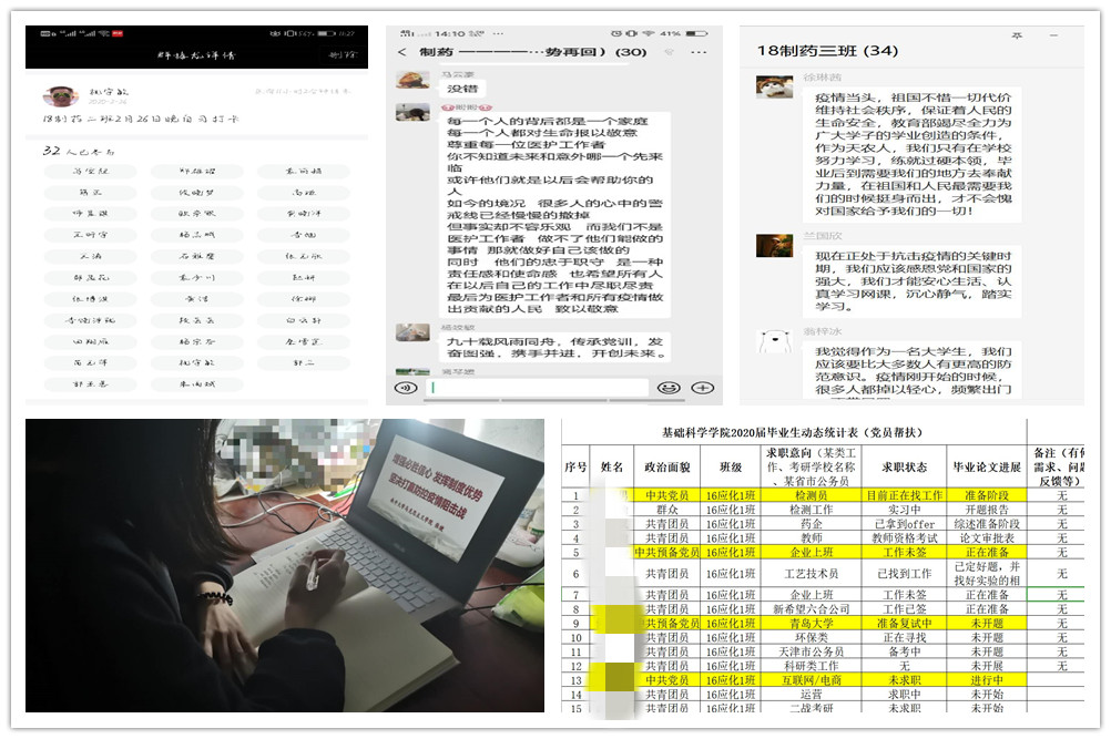 周到的云帮扶:基础科学学院学生党支部的28名毕业生党员在支部书记杜召辉的带领下,承担起毕业生就业指导帮扶工作,以“一对几”的模式与全院136名毕业生结对子,每周跟进同学们的就业情况、毕业设计情况和考研复试情况等,配合学院完成对毕业生的精准帮扶工作。