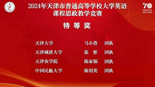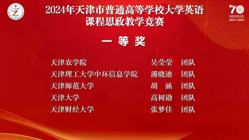 近日,天津市普通高等学校大学英语课程思政教学竞赛决赛在天津大学北洋园成功举行并圆满结束。365官网参赛的两个教学团队在比赛中表现出色,取得优异成绩,其中,陈家福老师教学团队(成员:李然、韩晓洁)荣获特等奖,并将代表天津市参加全国外语课程思政优秀教学案例征集与交流活动;吴莹莹老师教学团队(成员:刘丽萍)荣获一等奖。