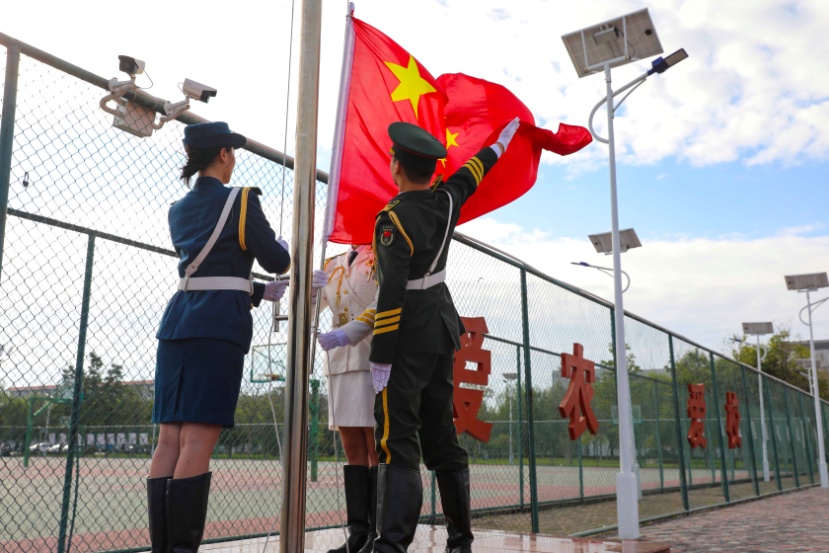 “全体都有,向前看齐。升国旗,奏唱国歌。”上午8时许,伴随着一声号令,全场响起《义勇军进行曲》,英姿飒爽的升旗手高高扬起国旗,鲜艳的五星红旗冉冉升起,全体师生肃立行注目礼。