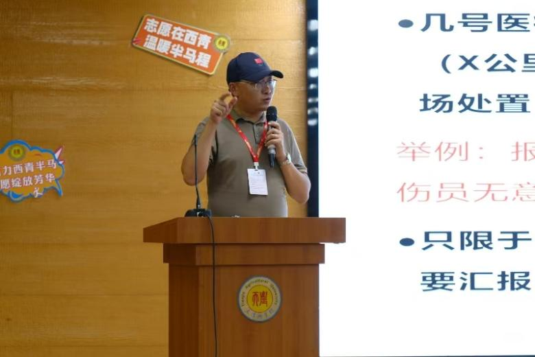 赛事医疗官谭永奇向全体大学生志愿者从赛事医疗、简单急救知识等方面进行详细的赛事医疗培训。