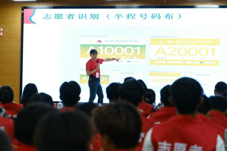 西青半马组委会刘彪向全体大学生志愿者从赛事情况、志愿者工作岗位分工、马拉松赛志愿者需知等方面进行详细岗位培训。
