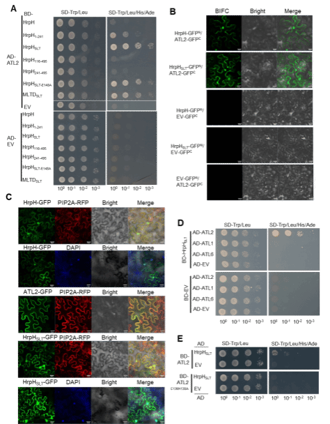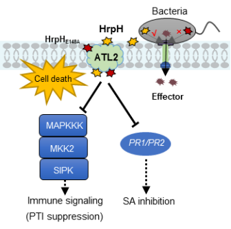T3SS是细菌重要的蛋白输出装置,由30kb约20个组分基因组成,负责将效应蛋白分泌到胞外并注入宿主细胞。近年来,对效应蛋白的研究已经比较深入,但对于T3SS组分的功能机制还缺乏足够了解。本研究前期发现在T3SS基因簇上存在一个特异的裂解性转糖基酶编码基因 hrpH ,该基因编码产物具有多个结构域,可以裂解细菌细胞壁并促进效应蛋白输出。本研究在此基础上系统研究了HrpH蛋白的多功能域特性,结果显示HrpH不仅参与调控效应蛋白转运,而且自身也可以转运至植物细胞,其保守的裂解性转糖基酶(SLT)结构域和第148位谷氨酸(E148)催化位点在转运过程中起到关键作用。HrpH蛋白和SLT结构域蛋白在植物质外体可以诱导细胞死亡、抑制由微生物分子相关模式诱导的基础免疫反应(PTI)和水杨酸(SA)信号途径,且这一功能并不依赖E148催化位点。在植物中稳定表达HrpH能够抑制PTI反应和SA信号途径,降低植物的抗病能力。此外,本研究还发现HrpH可以与植物中的RING-type E3泛素连接酶ATL2互作,且SLT是互作的关键结构域。同样,这一互作也不依赖于E148催化位点。本研究揭示了HrpH在III分泌系统转运及其与宿主互作过程中的双重功能:在细菌胞内,HrpH作为一种裂解性转糖基酶参与T3SS组装和效应蛋白转运;当其与植物互作时,HrpH作为一个免疫调节子靶向植物泛素连接酶调控植物免疫。该成果突破了T3SS作为一个蛋白“注射器”的传统认识,将为深入理解T3SS多功能机制提供新的思路。