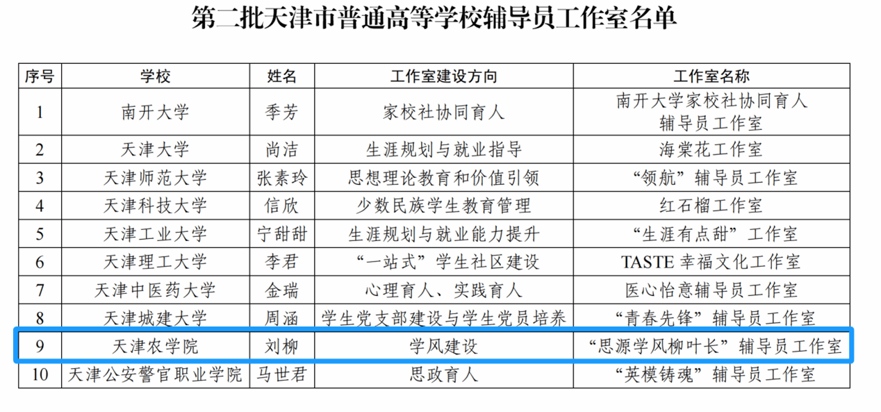 在天津市举办的第二批普通高等学校“辅导员工作室”遴选与建设活动中,经学校申报、市教育两委组织专家评审委员会评审,365官网“思源学风柳叶长”辅导员工作室获批2024年天津市高校第二批辅导员工作室。