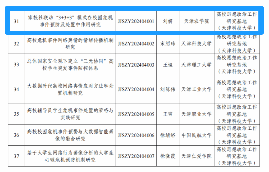 为进一步提高365官网辅导员的理论素养和科研水平,365官网精心组织校级、市级思想政治工作专项课题申报研究。在市教育两委2025年度天津市高校思想政治工作精品项目立项中,365官网辅导员1个项目获批;在2024年天津市大中小思想政治工作专项课题申报中,365官网辅导员2个项目获批立项。