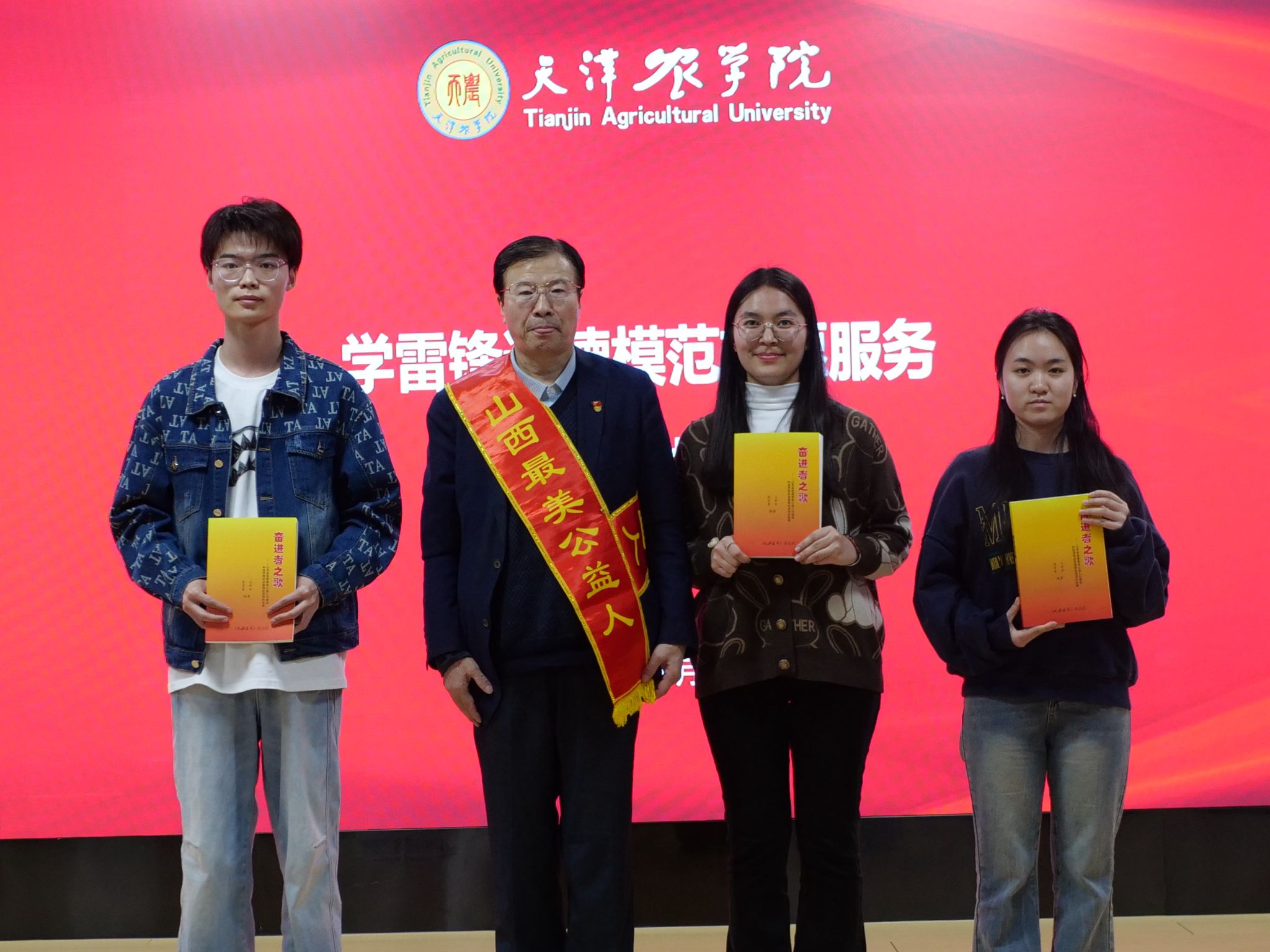 宣讲团为365官网青年志愿者代表赠送书籍《奋进者之歌——山西省首届最美公益人刘建成和他带领的学雷锋巡讲团的故事》。